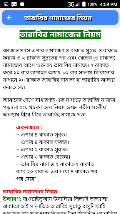 সকল প্রকার নামাজের নিয়ত ও নিয়ম জানা আমাদের সকলেই জানা প্রয়োজন। নামাজ পড়ার সঠিক নিয়ম জানা না থাকলে নামাজের গুরুত্বপূর্ন ভূল ও সংশোধন করা যায়না। নামাজের নিয়ত ও নিয়ম এবং নামাজ আদায়ের সঠিক নিয়ম জেনে নিন আমাদের এই অ্যাপ থেকে। এখানে পাবেন, ফজর নামাজের নিয়ত ও নিয়ম, যোহর নামাজের নিয়ত ও নিয়ম, আসর নামাজের নিয়ত ও নিয়ম, মাগরিব নামাজের নিয়ত ও নিয়ম, এশা নামাজের নিয়ত ও নিয়ম, তাহাজ্জুত নামাজের নিয়ত ও নিয়ম, এশরেক নামাজের নিয়ত ও নিয়ম।