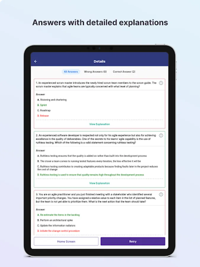 All the test content on the app are curated by ScrumPass experts. As you take the tests, you will be able to track a summary of your progress directly on the app. You will know which areas you need to improve on to improve your Agile Knowledge and to become a Agile Project Manager.