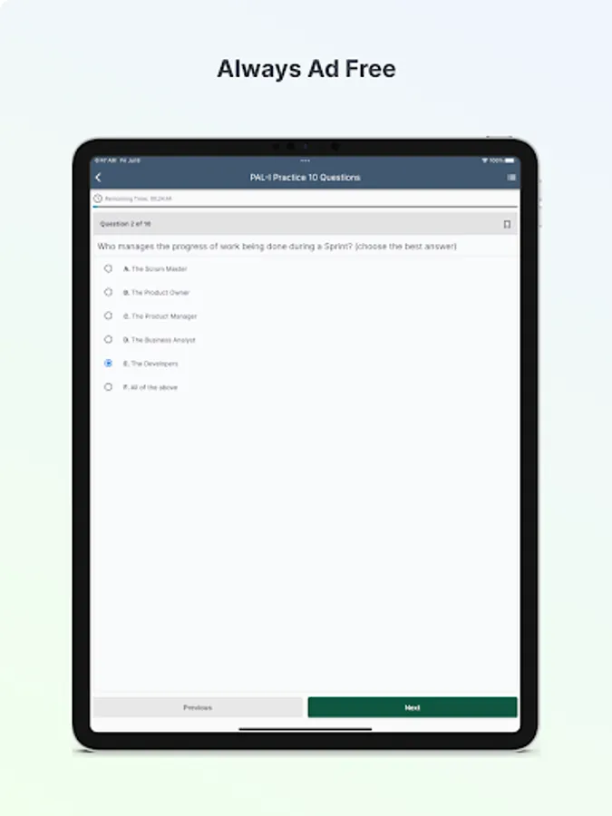 We regularly update the question set with the real exam content. If you take our PAL exams frequently and aim at achieving at least 85% on all the exams you take, you will easily pass the real Scrum examination. Download PAL-I Exam Simulator and get yourself familiarize with the PAL-I exam. You can use our application from anywhere and at any time.