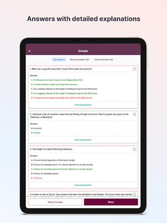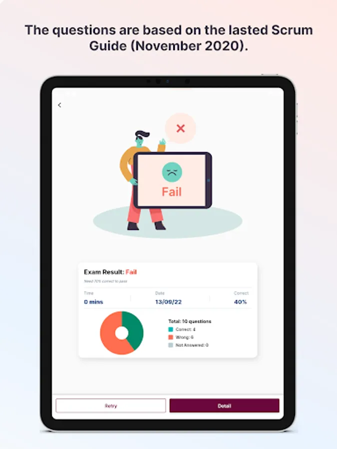 All the test content on the app are curated by ScrumPass experts. As you take the exams, you will be able to track a summary of your progress directly on the app. You will know which areas you need to improve on to improve your Scrum Knowledge and to become a Agile professional.