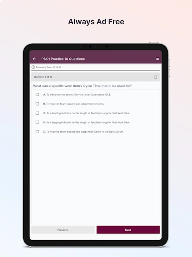 Welcome to PSK Exam Simulator application. You can improve and validate your basic knowledge of the Professional Scrum with Kanban Exam. With PSK Exam Simulator you can improve your Agile & Scrum knowledge and help you to pass on your first try scrum.org or PMI certifications.