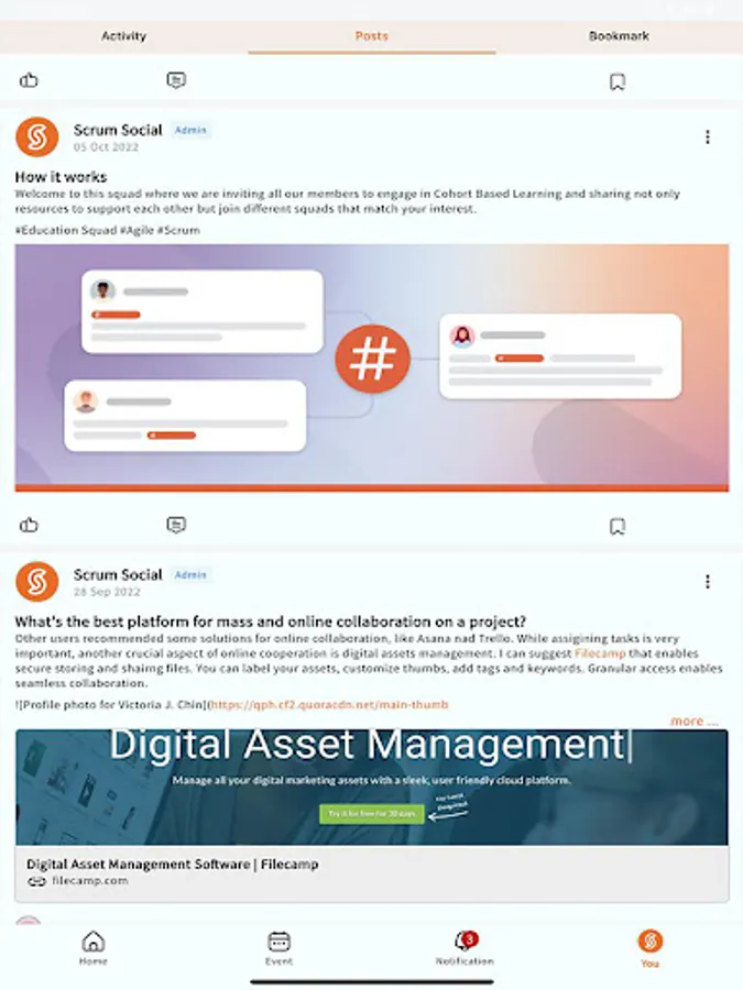 Provides you with the option to share your ideas, passions, work life, adventures, challenges, important announcements and other important information with other Scrum Masters and the community.