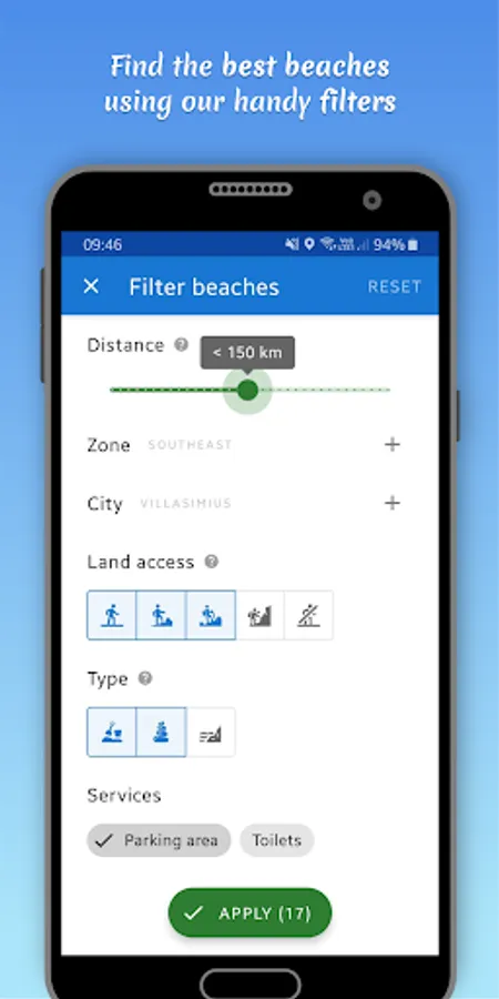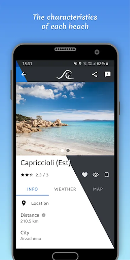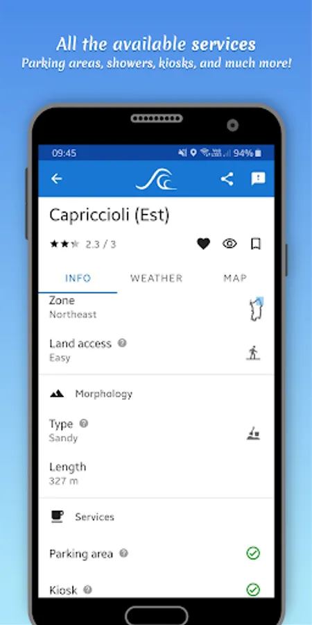The search and filtering functions help you choose the beach to visit based on your location, the current weather conditions, the available services, and much more!