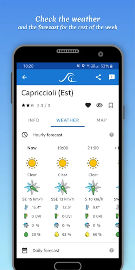 Check the daily weather conditions for each beach, and the forecast for the rest of the week. Our easy-to-read reports include the wind speed and direction, the temperature and humidity, the index of ultraviolet rays, and the probability of precipitations.