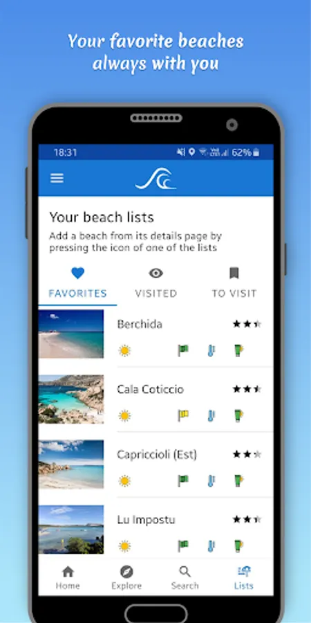 In love with a beach? You can organize your favorite beaches, the ones you have already visited, and the ones you would like to see in the future using our handy lists.