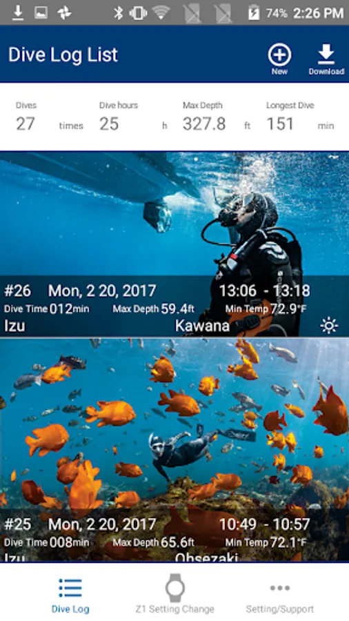 With "Z dive log" and "SCUBAPRO Diving Computer Z1" you can enjoy diving log management and Z1 settings easily. You can download Z1's diving log data via Bluetooth and you can enter the diving point, weather etc on the smartphone.
