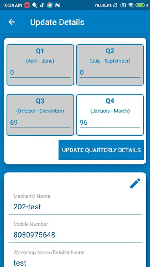3. Update Quarterly purchase details for each Mechanic workshop viz. Q1, Q2, Q3, Q4.