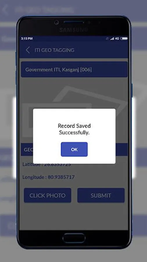 4. As soon as the ITI clicks on “Submit Photo” the Latitude & Longitude of the ITI location will be displayed on the mobile screen and a message will be displayed that “Geo Tagging has been done successfully”.