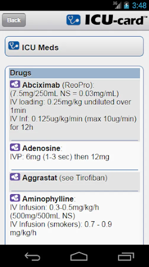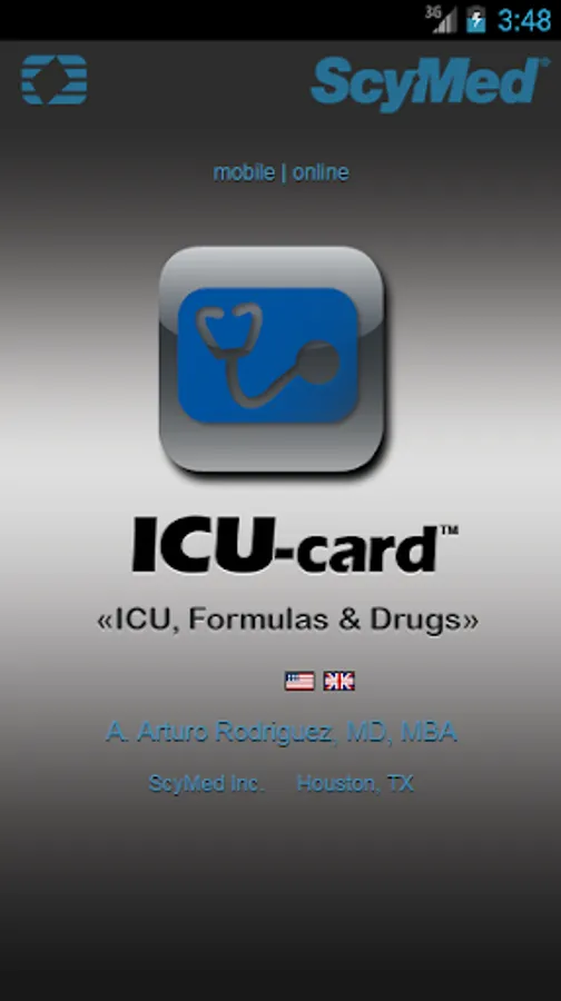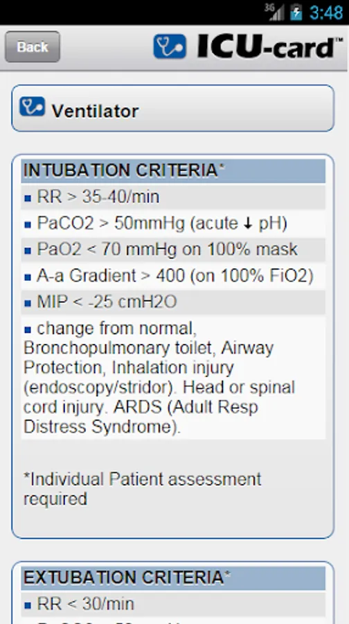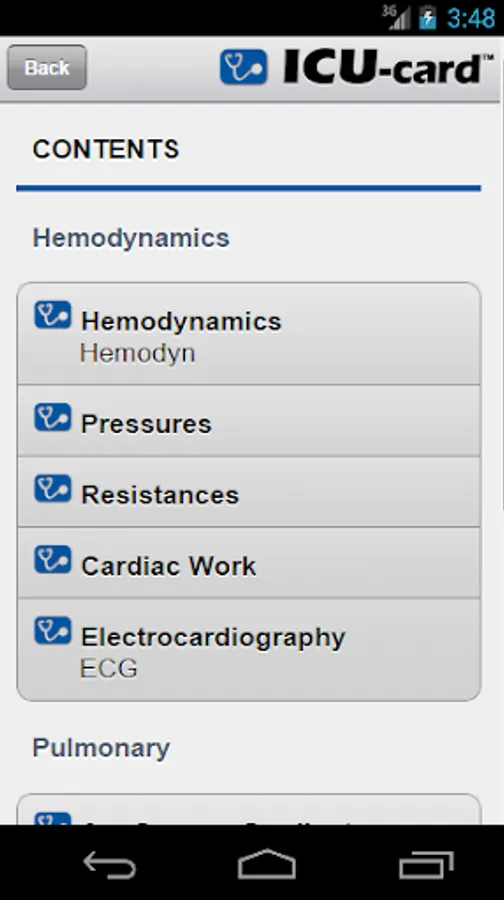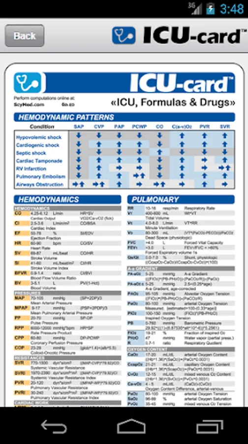 The ICU-card™ App includes drugs, dosages, formulas, equations and normal values for hemodynamics, pulmonary, renal, nutrition, etc.