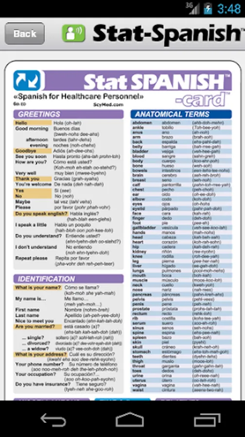 The Stat Spanish™ is an efficient translation resource, not an english-spanish dictionary, it includes the context-oriented, commonly used, words and phrases needed in the medical office and Hospital settings.
