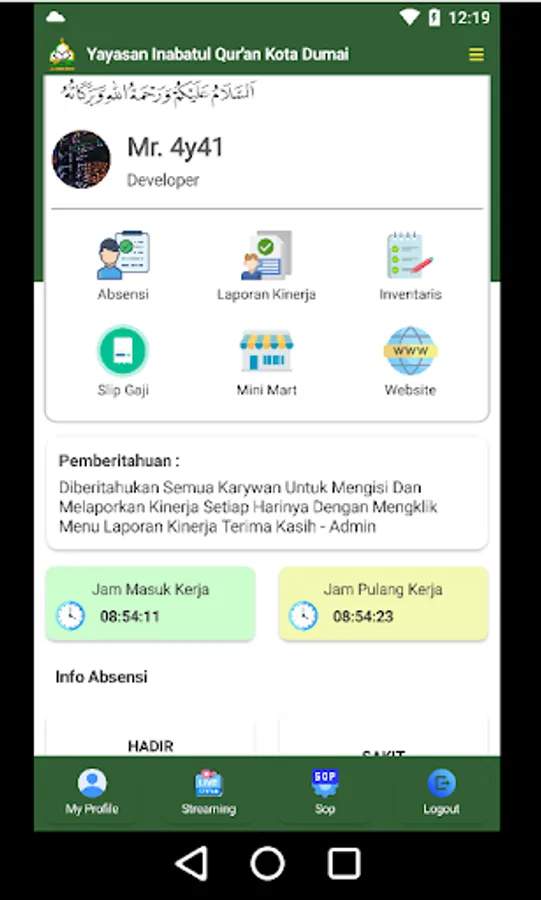 Application for employee attendance at sd qu inabah jaya mukti and various features in which there is performance reporting and others