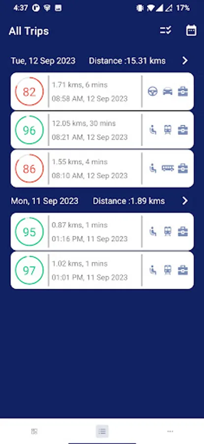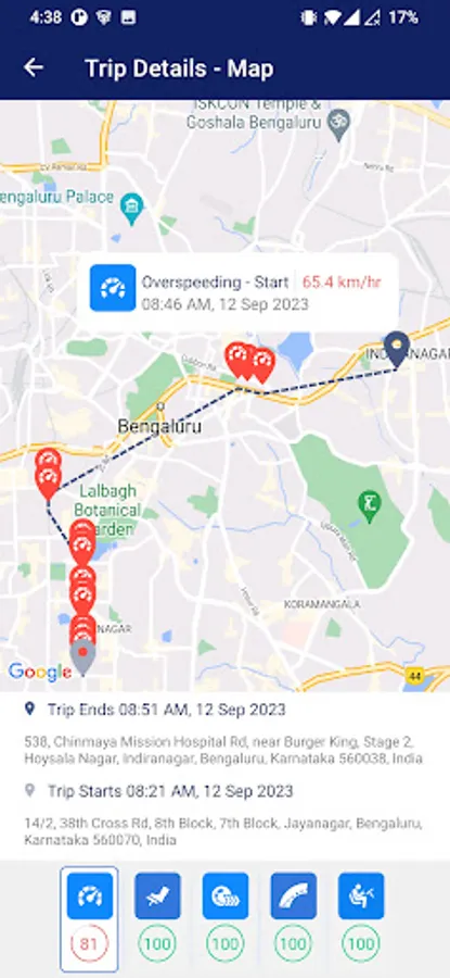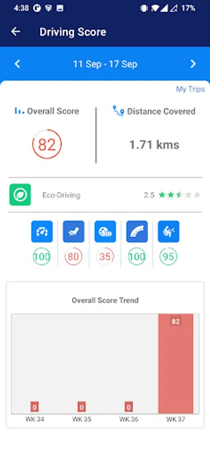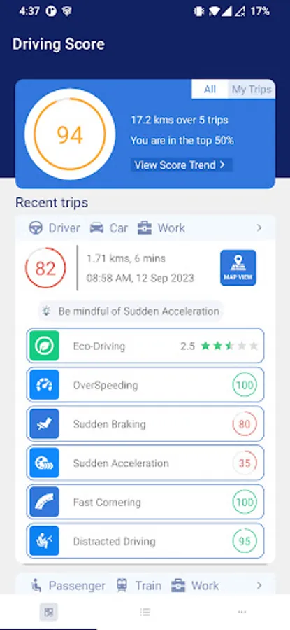 Home screen shows your consolidated Safe Driving Score (out of 100). It also shows summary of your recent trips. Tapping on the Location Icon shows for any trip shows the exact route of the trip, the location and severity of various Driving alerts. App’s "All Trips" screen shows the log of your historical trips organized by each day. Tapping on any particular trip shows the Trip summary for that trip. Driving Score trend screen shows you the weekly trend of your Safe Driving score and its constituent scores.