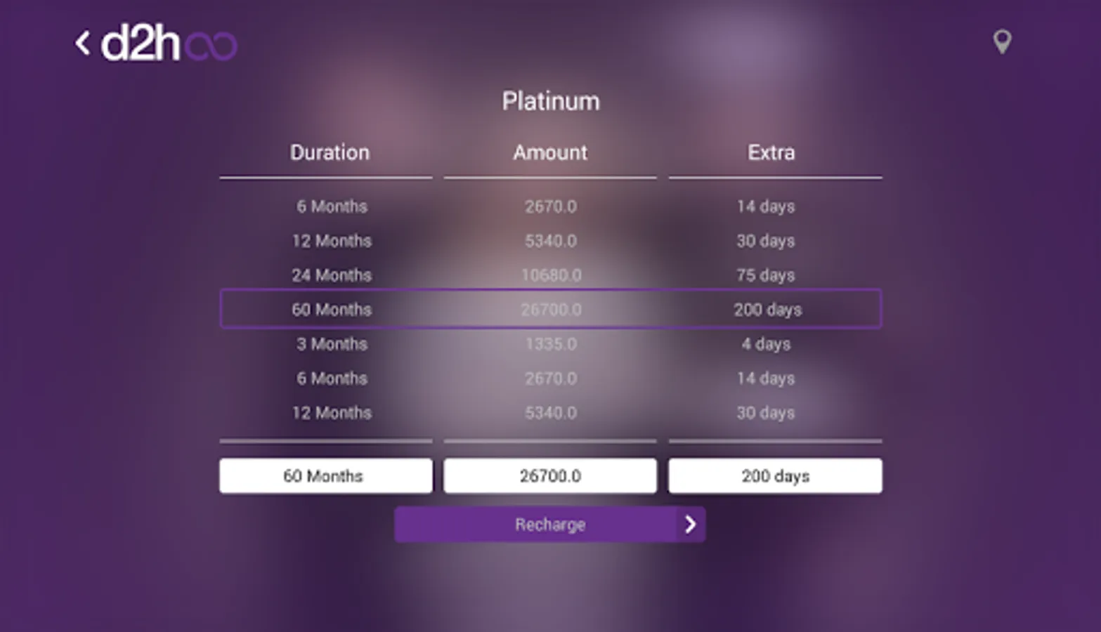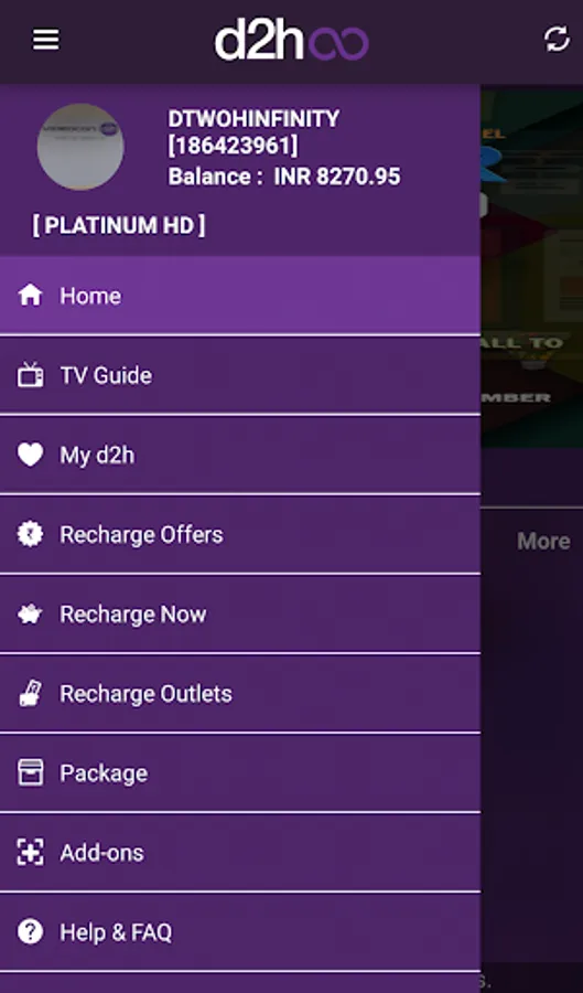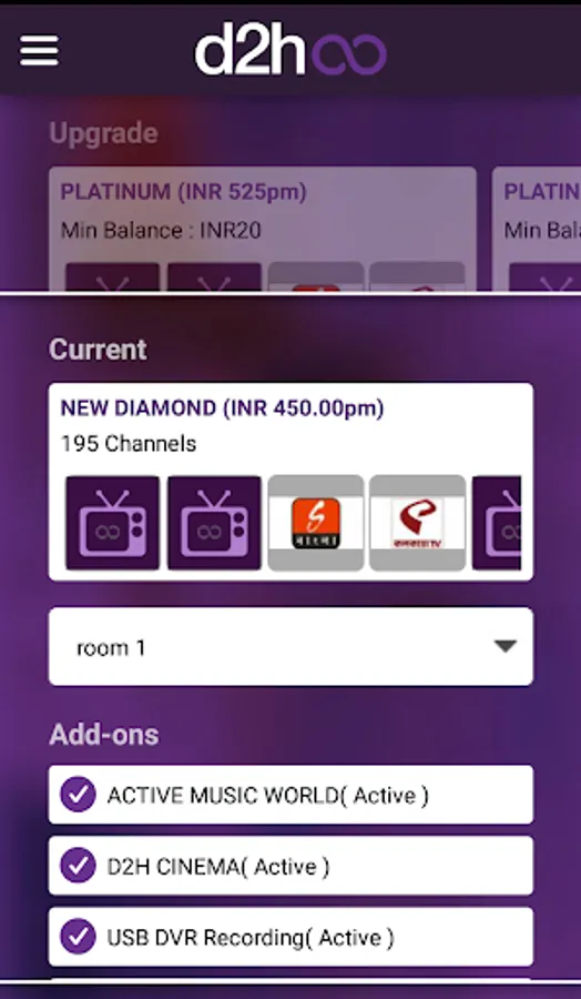 · Experience quick and instant recharges with d2h Infinity app. Pay for recharge using debit card, credit card, net banking, etc.