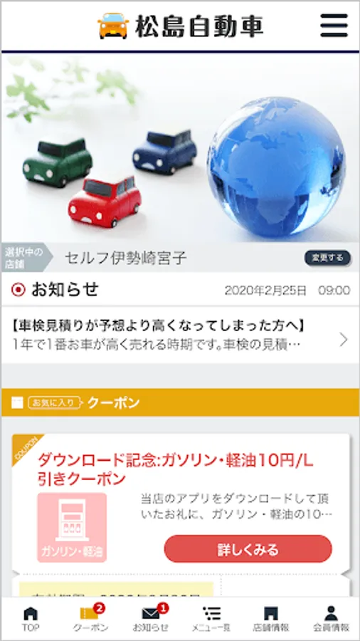 Our official app "Matsushima Motor" allows you to easily make reservations for car wash and coating, manage maintenance of your car, and also distribute discount coupons and discount information for various menus that can be used at our shop. ..