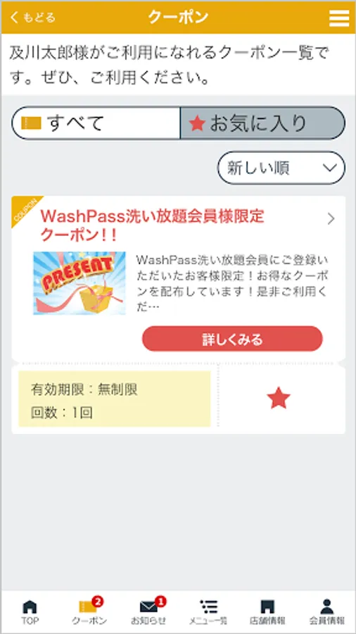 当社の公式アプリ「サントーコーSSアプリ」ではWashPass(セルフ洗車機 洗い放題会員)のお申し込み・お支払い・ご利用いただけます。またアプリにて当店で利用いただけるお得なクーポンや各種メニューの割引情報を配信しております。