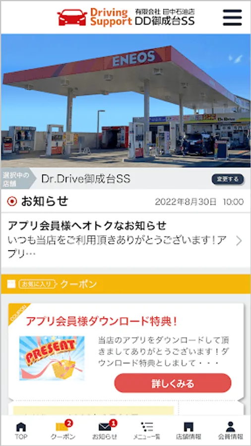 Our official app "Tanaka Oil Store SS App" collects stamps every time you visit, wash your car, or perform car maintenance, and if you save a fixed number of stamps, you can redeem them for a great gift coupon. It's a nice and profitable app.