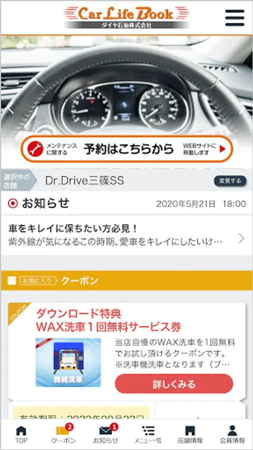 Our official app "Diamond Oil" allows you to easily make reservations for car wash and coating, manage maintenance of your car, and also distribute discount coupons and discount information for various menus that can be used at our shop. ..