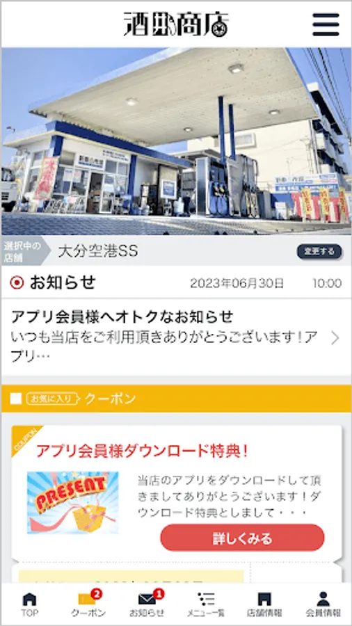 Sakai Shoten Co., Ltd. operates service stations in Oita Prefecture and offers a wide range of services to provide total support for customers' vehicles. Our app "Sakai Shoten Member App" allows you to manage various services including stamp management, as well as distribute discount coupons and discount information for various menus that can be used at registered stores.