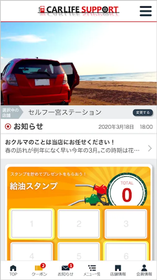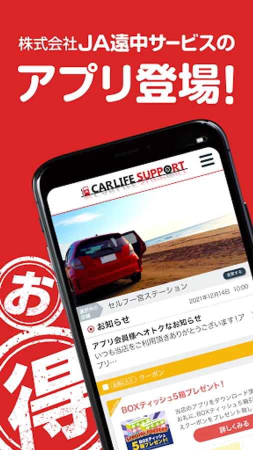 With our app "JA Tonaka Car Life Support", you can easily make reservations for car washes, coatings, etc. and manage the maintenance of your car, as well as coupons and discounts on various menus that can be used at registered stores. Distribute information, collect 1 stamp for refueling 20L or more, and collect a set number of stamps to exchange for a special coupon.
