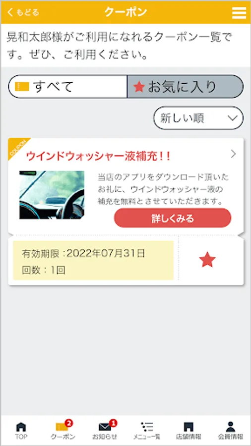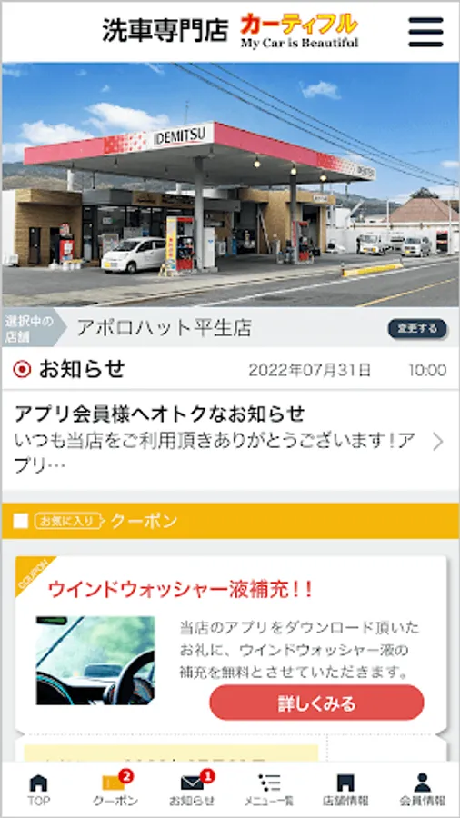 Our official app "Car wash specialty store Curtiful" collects stamps every time you refuel, car maintenance, car wash, car coating, and if you save a fixed number of stamps, you can exchange it for a great gift coupon, you can save and have fun It's a nice and profitable app.