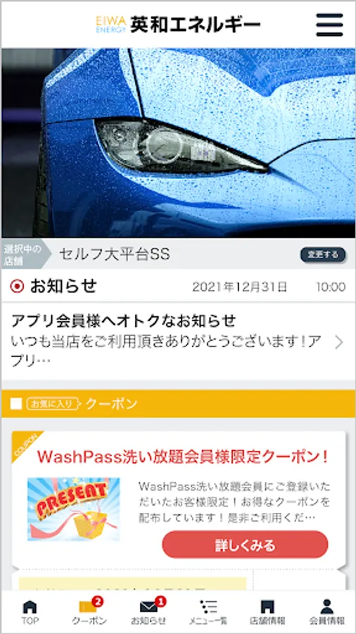 You can apply for, pay for, and use WashPass (self-car wash machine, all-you-can-wash member) with our official app "Eiwa Energy". In addition, we deliver discount coupons and discount information for various menus that can be used at our shop through the app.