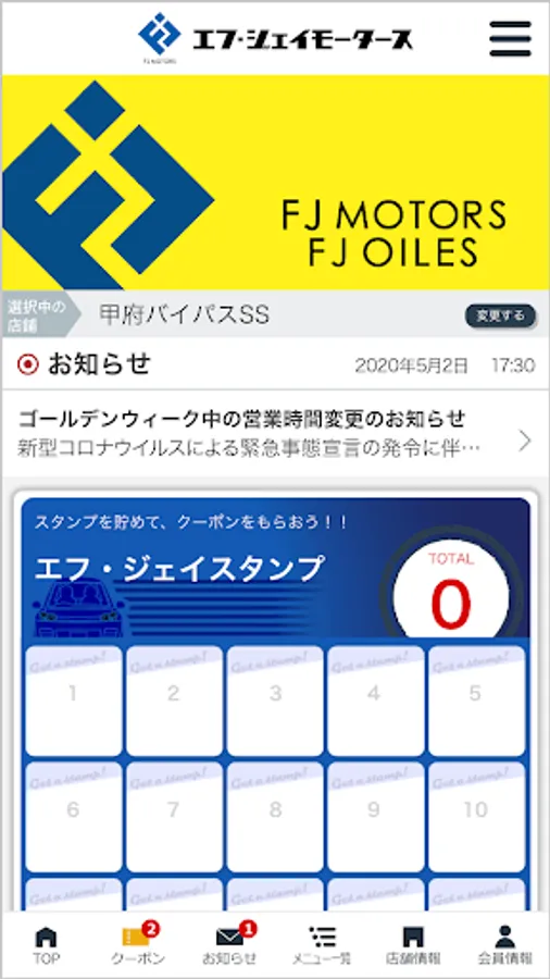 With our app "FJ Motors", you can easily make reservations such as car wash with the app. In addition, stamps are accumulated every time you refuel or rent a car, and you can redeem a discount coupon by accumulating a fixed number of stamps. We also deliver discount coupons and discount information for various menus that can be used at registered stores.