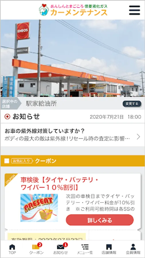 当社のアプリ「信菱液化ガス カーメンテナンス」ではアプリで簡単に洗車・コーティングなどのご予約や愛車のメンテナンス管理が可能の他、ご登録いただいた店舗で利用いただけるお得なクーポンや各種メニューの割引情報を配信しております。