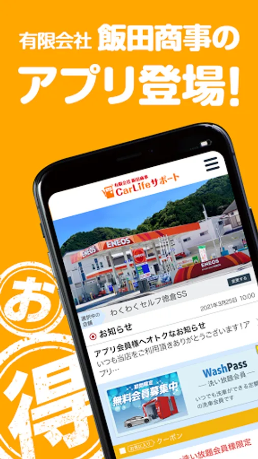 Our official app "Iida Shoji CarLife Support" allows you to apply, pay, and use WashPass (self-service car wash unlimited membership).