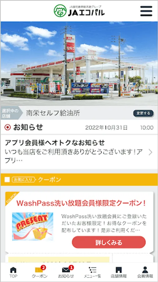Our official app "JA Ecopal Co., Ltd." allows you to use the car wash service with the app, and also distributes discount coupons and discount information for various menus that can be used at our shop.
