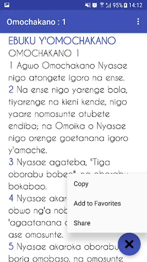 We wish to take this opportunity to thank our God in heaven, for grace and undying love. We also thank those who helped, in typing the raw text of the Ekegusii Bible, proofreading and uploading the data into the data base. We can't mention you all by names. May God bless you all. Thanks also to those who have been praying on this noble course. Thanks also to those who have been inquiring about the app. Now here we have it. May it help us in our daily Christian life. Let us now read, memorize and meditate the Word of God in Ekegusii, it is the light unto our paths.