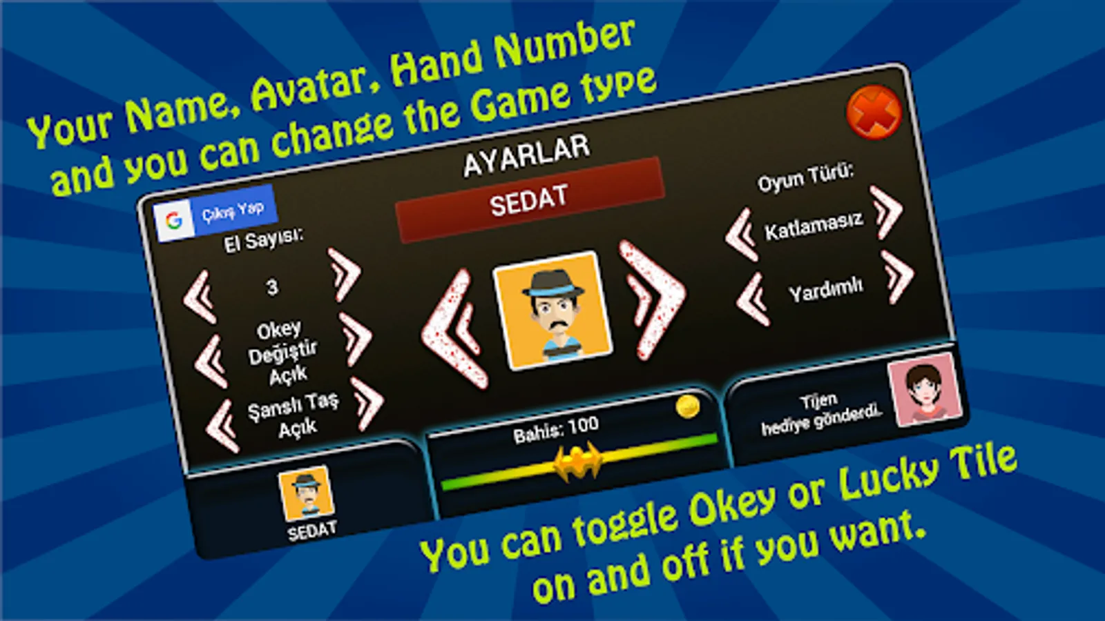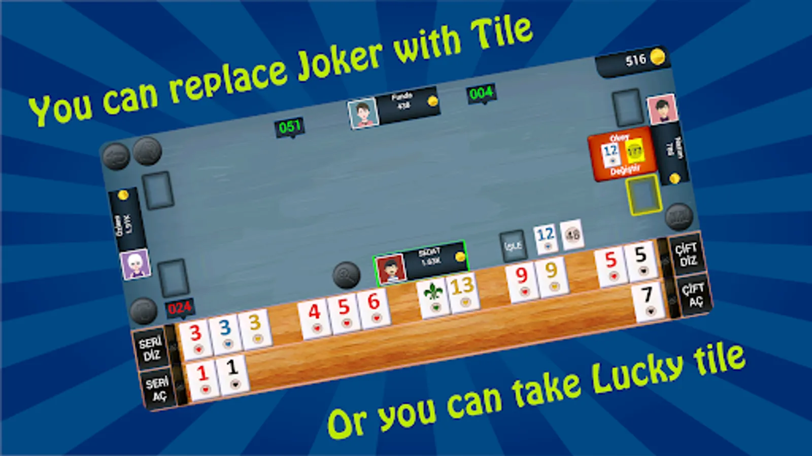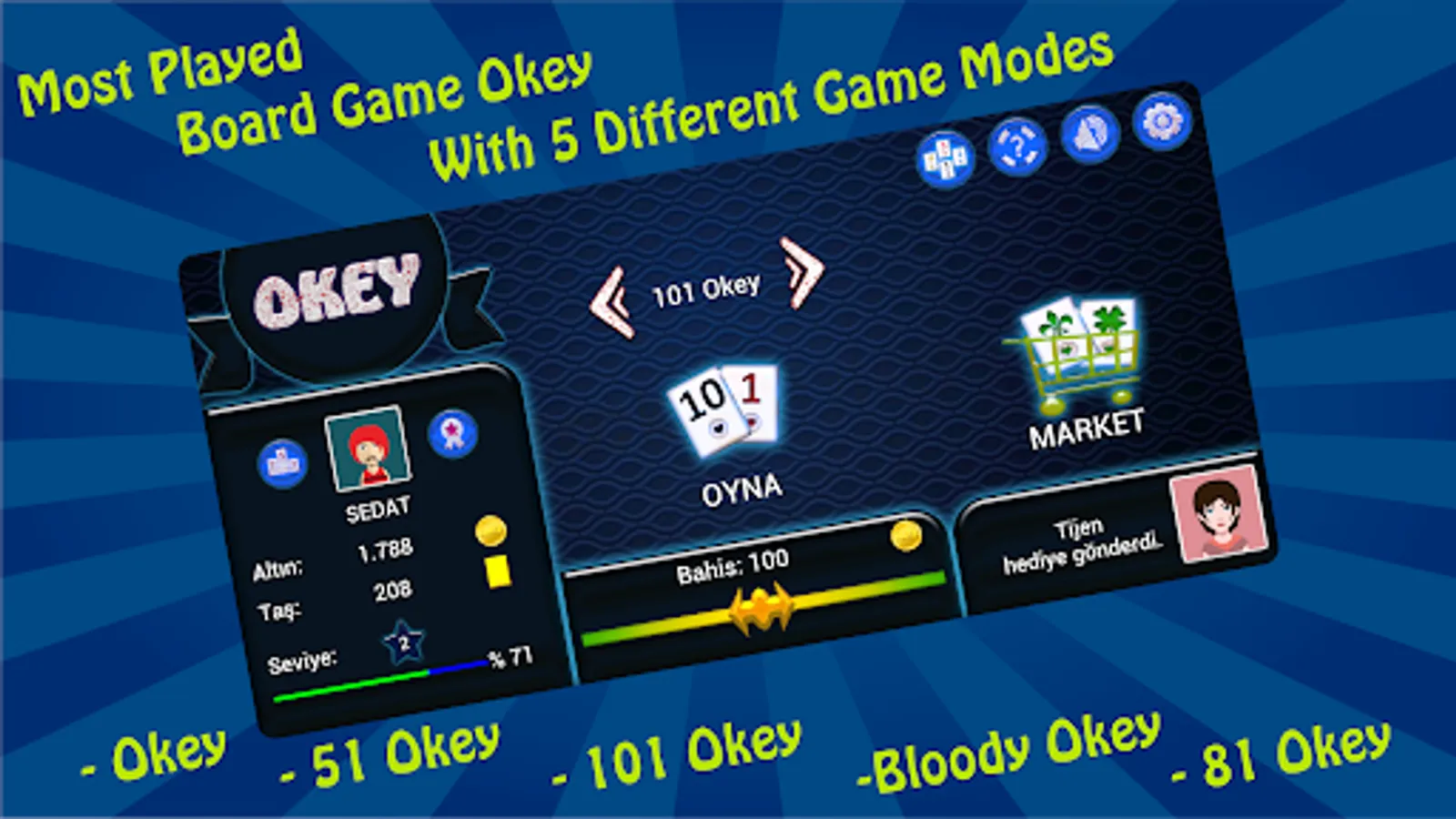 5 different modes, Classic Okey, 101 Okey, 51 Okey, Bloody Okey and 81 Okey, in one application and without internet. Play for free whenever you want, at home, on the road, wherever you want from your Phone or Tablet.
