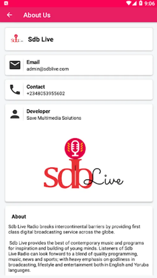 Viewers and Listeners of Sdb Live TV/Radio can look forward to a blend of quality programming, music, news and sports; with heavy emphasis on godliness in broadcasting, lifestyle and entertainment both in English and Yoruba languages. The station also intends to interact with the local social, political, religious and institutional communities.