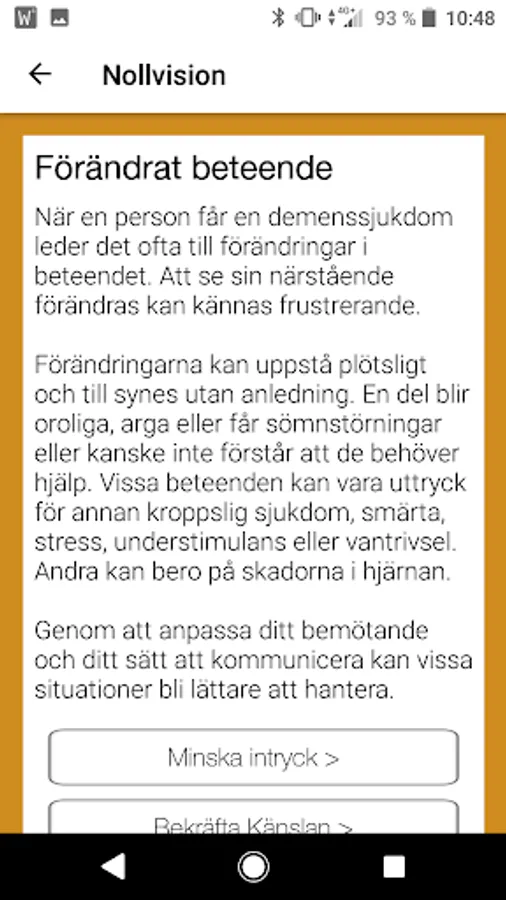 Perhaps you know that dementia diseases can be different dependent upon the area of brain damage. Memory, perception of time and orientation usually deteriorate which make it difficult for the person in question to plan and carry our everyday tasks. It isn’t unusual either with a change in behaviour e.g. to become aggressive or anxious. This can be difficult to cope with for both you and those nearby. Today there is no legal support for force or restraint in the care or wellbeing of a person with dementia. Instead it is a matter of trying to prevent and avoid difficult situations with the help of knowledge and treatment. In order to be able to understand the information in this app it is of an advantage to have some understanding of what dementia means and what the consequences can be.