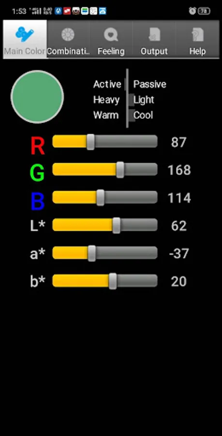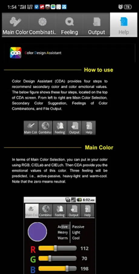 其頁面顯示使用者所設定之主色,可經由RGB、CIELab與CIELch三種方式設定。設定完主色之後,APP可預測“躍動的-沉靜的(Active-Passive)”、“重的-輕的(Heavy-Light)”與“溫暖的-寒冷的(Warm-Cool)”之感覺強弱。