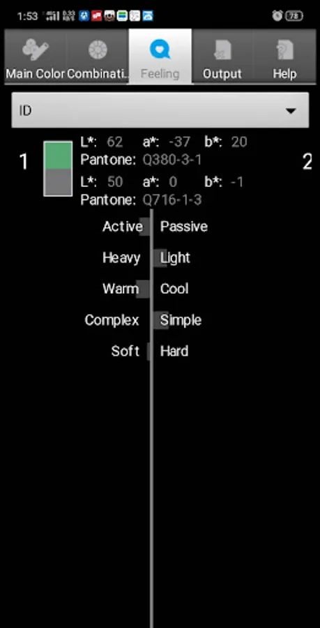 APP提供每組配色之情感感受,包括“躍動的-沉靜的(Active-Passive)”、“重的-輕的(Heavy-Light) ”、“溫暖的-寒冷的(Warm-Cool) ”、“複雜的-簡單的(Complex-Simple) ”、“柔軟的-堅硬的(Soft-Hard) ”、“新的-舊的(New-Old) ”、“新鮮的-腐壞的(Fresh-Stale) ”、“愉快的-悲傷的(Happy-Sad) ”、“幽默的-嚴肅的(Humorous-Serious) ”、“強壯的-柔弱的(Strong-Weak) ”,共10對情感感受。此外,APP亦提供各對情感感受上色彩組合之排序。