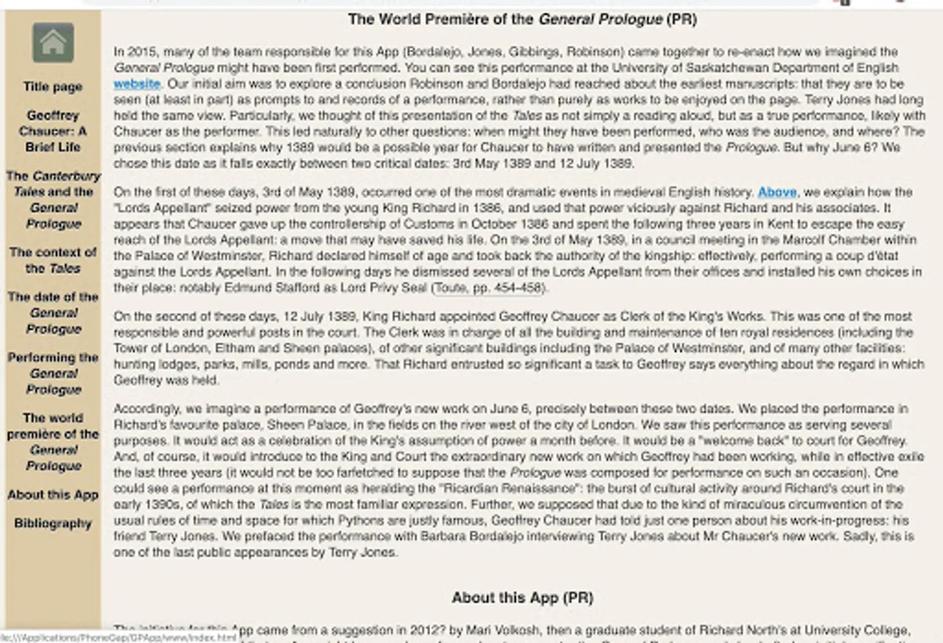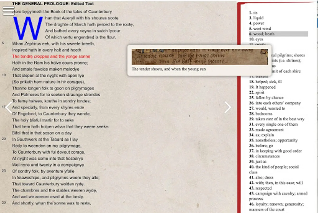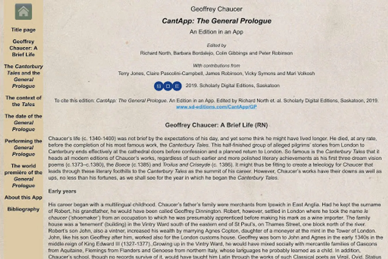 A full reading of the General Prologue of Geoffrey Chaucer's Canterbury Tales. With edited text, commentary, glossary, sound files and Terry Jones' translation. Prepared by Colin Gibbings, Richard North, Peter Robinson and Barbara Bordalejo.With advice from James Robinson, based on an idea by Mari Volkosh.