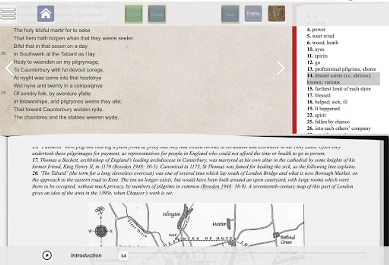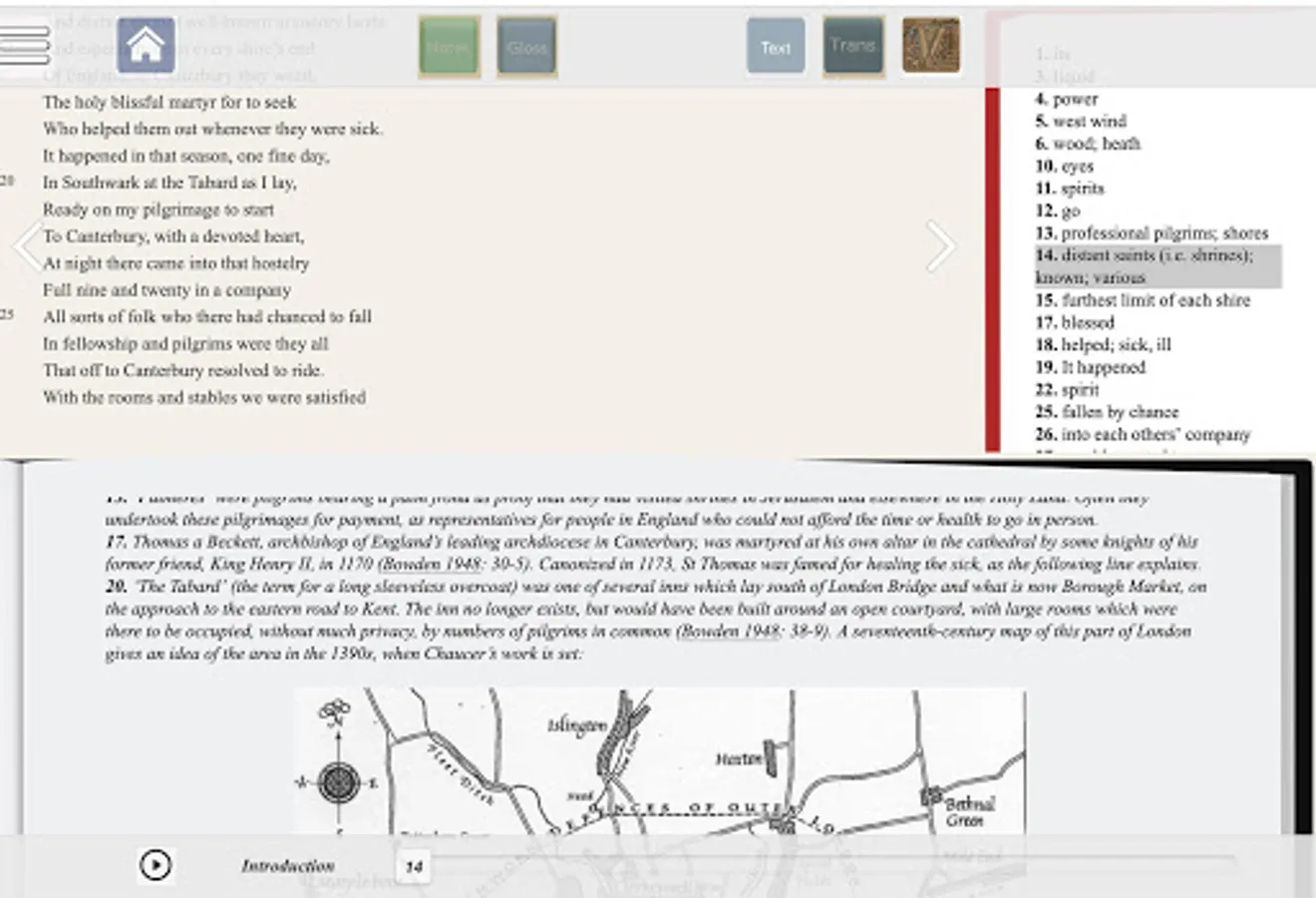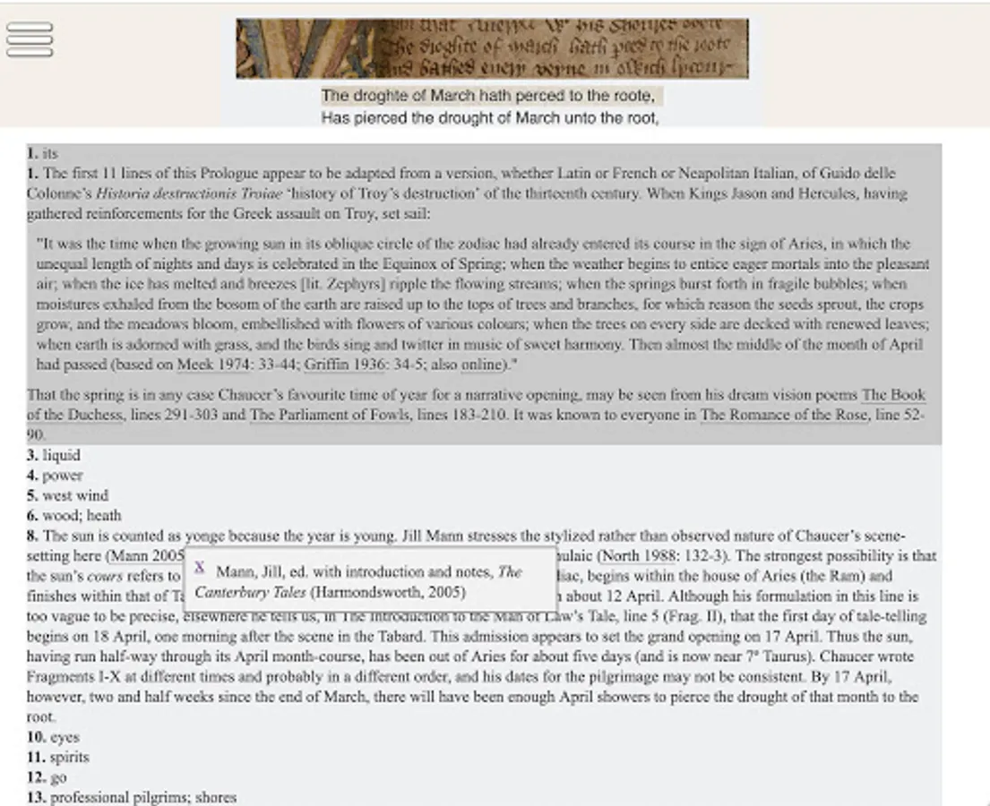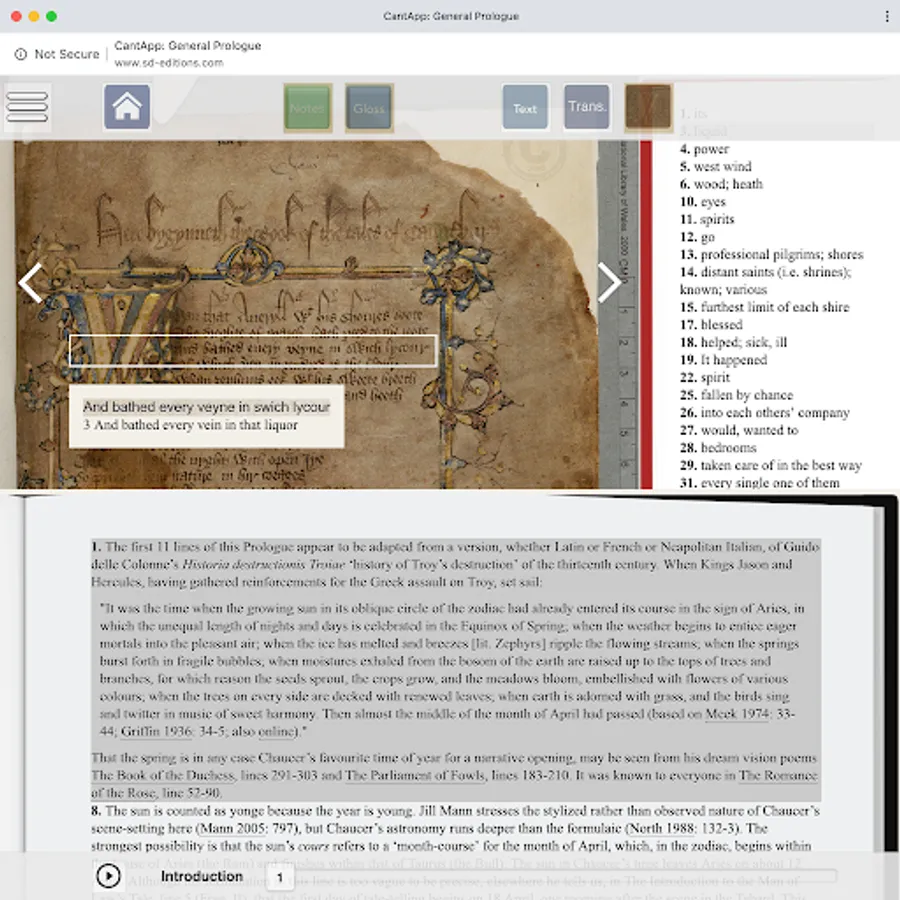 A full reading of the General Prologue of Geoffrey Chaucer's Canterbury Tales. With edited text, commentary, glossary, sound files and Terry Jones' translation. Prepared by Colin Gibbings, Richard North, Peter Robinson and Barbara Bordalejo.With advice from James Robinson, based on an idea by Mari Volkosh.