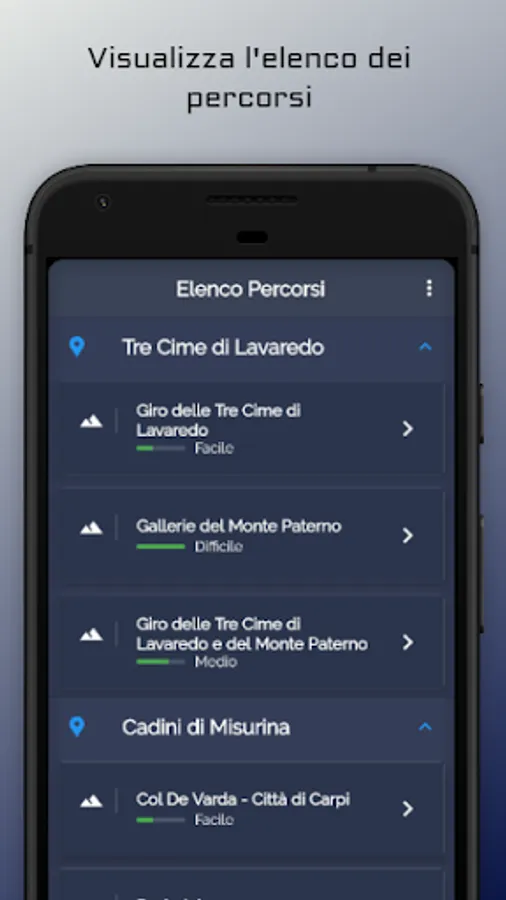 The routes are grouped by mountain group and for each route various useful information are indicated (departure and arrival point, travel time, etc.) plus a complete description with all the information necessary to complete your excursion safely and fully enjoying the landscapes Dolomites.