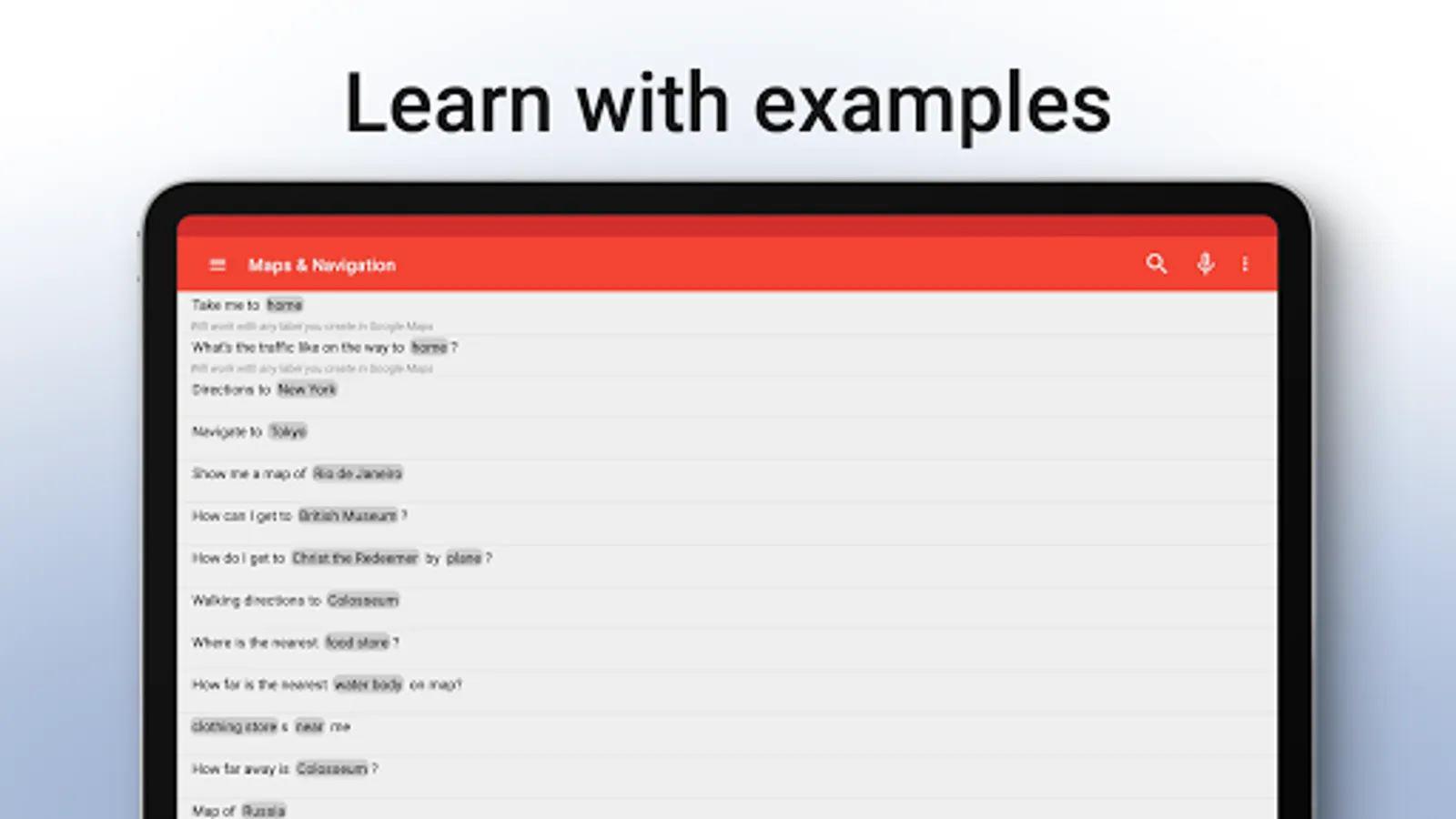 Discover commands, see possible examples, understand the usage of over 300 hands-free actions (commands) you can say to Google Assistant in your phone and find them in just a few taps! Everything you may ask your phone to do, from Search and Navigation, to Messaging and fantastic Easter Eggs are presented to you in the most intuitive and beautiful way in this full OK Google guide.