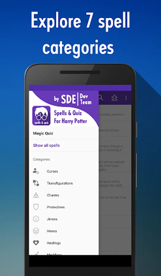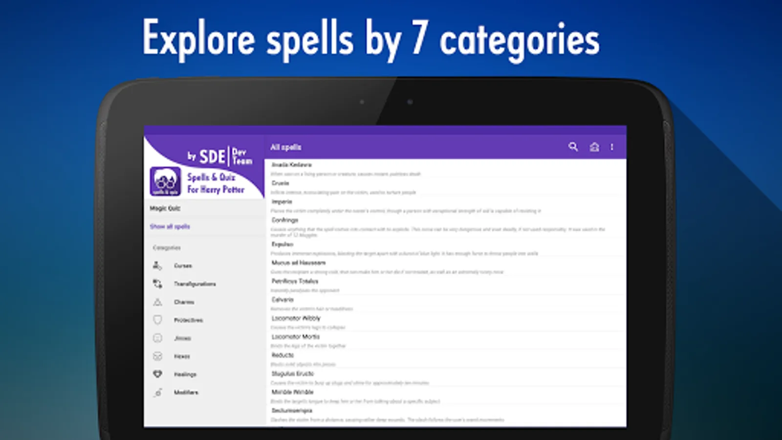 Discover Harry's Spells and challenge yourself right away in our Spell Quiz. This easy to understand spell guide will teach you everything about magical spells. Here are all the spells from magical wizard world, organized and described. All spells from books and movies about HP adventures can be found in this app!