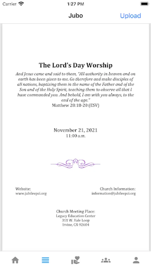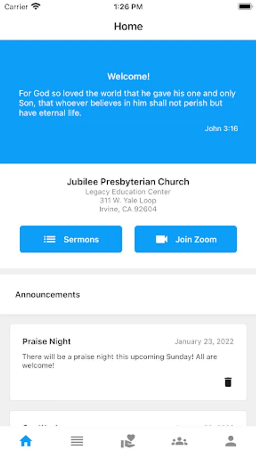 This app is for members of Jubilee Presbyterian Church. It allows users to view the directory of members, view announcements, listen to previous sermons, and request prayer topics.
