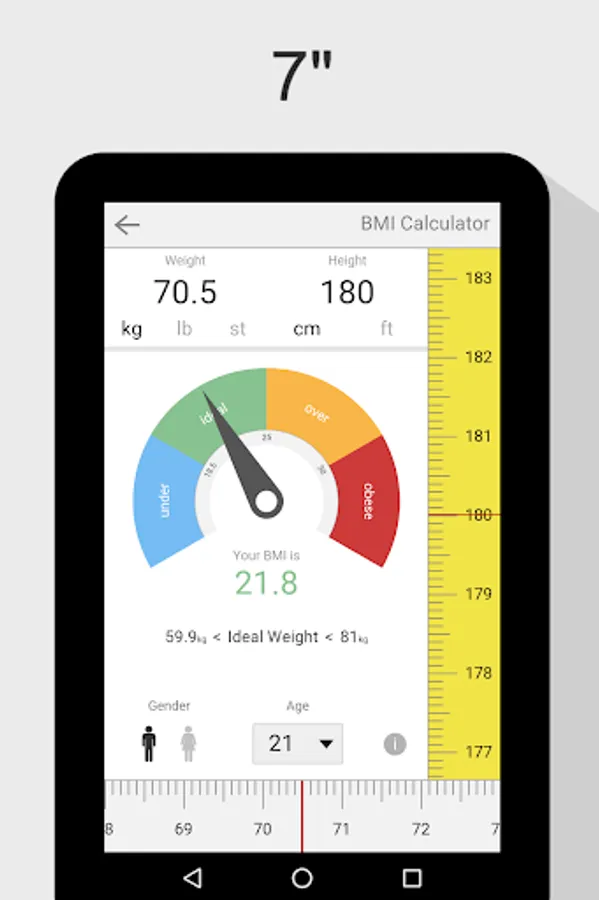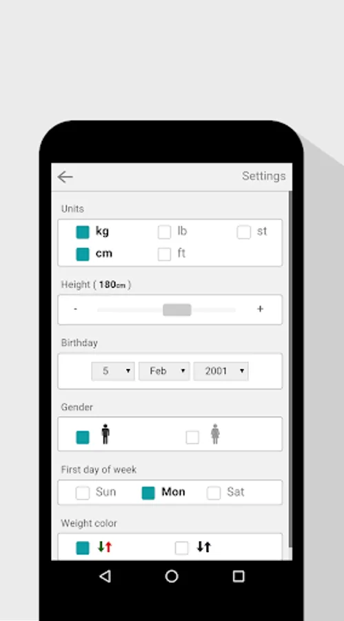 Next to tracking your weight loss progress, our app gives you correct BMI values, based on your height and weight ratio as well as your ideal weight range.