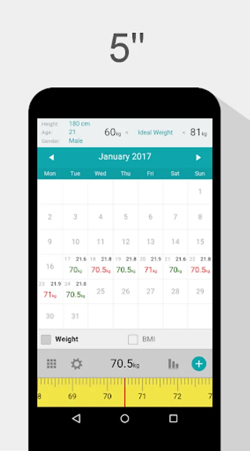 Our weight tracker/calendar and BMI app gives you the much needed support and nudge in the right direction. Day by day, monitor your weight by scrolling the measuring tape to input your weight values.