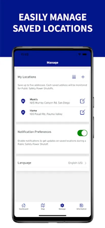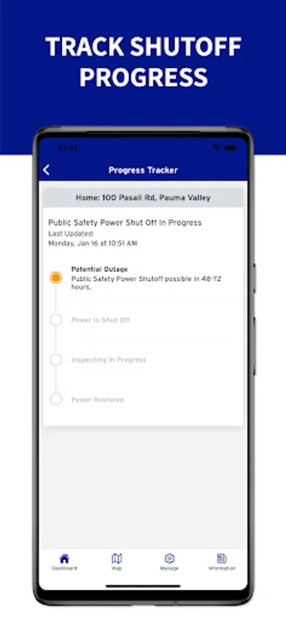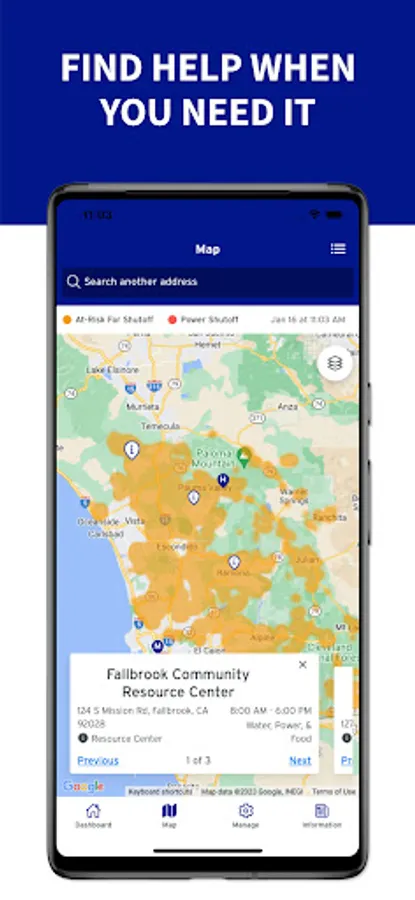 Easily get the status and timely updates for PSPS events for your saved locations, understand the Community Resource Centers available near your locations and get real-time estimated restoration times.