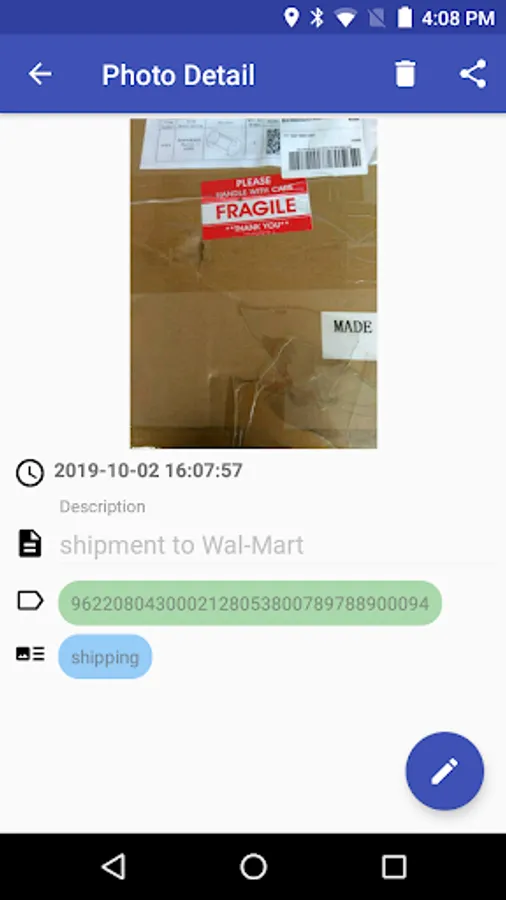Logistics / Shipping - proof of shipment condition. Scan the package tracking number or way bill. Take photos of products before they are shipped to record shipment condition.