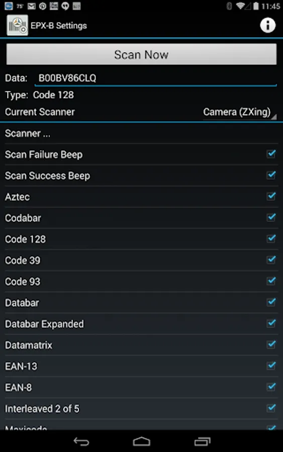 EPX-Barcode (EPX-B) provides support for reading (scanning) barcodes using the device camera or external USB scanners. EPX-B includes a the Scan Now application that copies the scanned barcode data to a list. Tap to search Google or Amazon. Optionally, it stays in the notification area for quick scans. Switch the Settings to batch mode or fixed focus, and increase your productivity on multiple scans. Reads multiple barcodes with 1 scan.