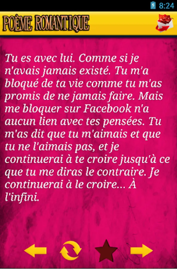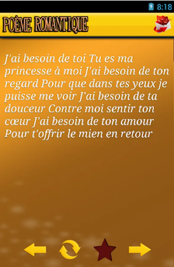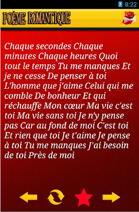 Use this application is free and easy to understand. Just open the application and read the most beautiful love poems and romantic French for him, for her ... choose your poem to express your feelings ♥
