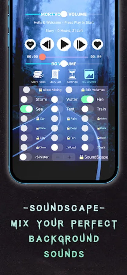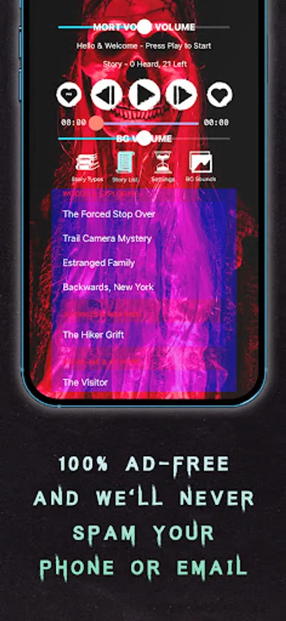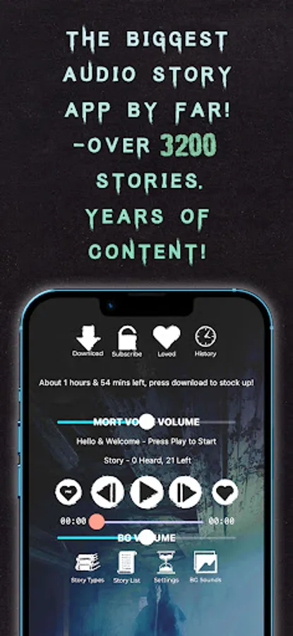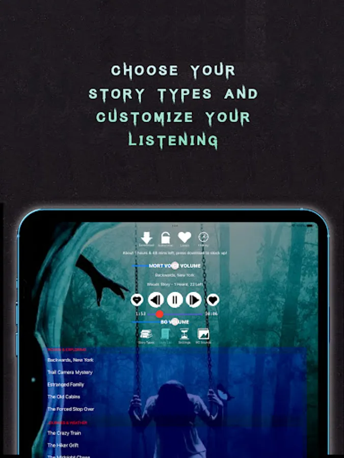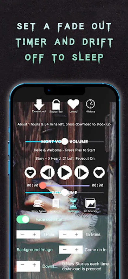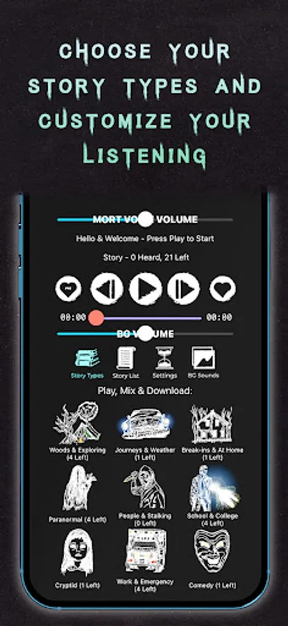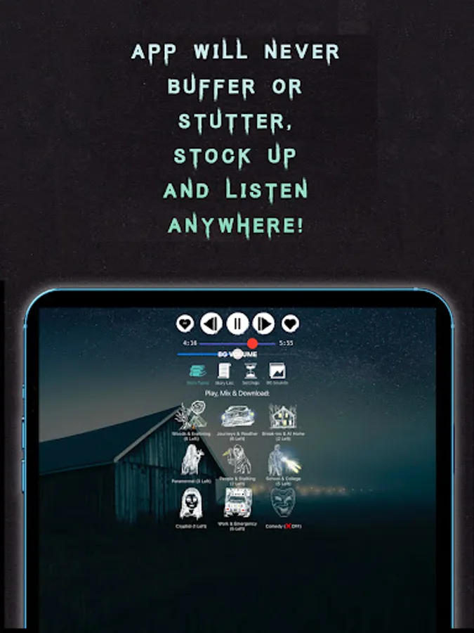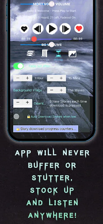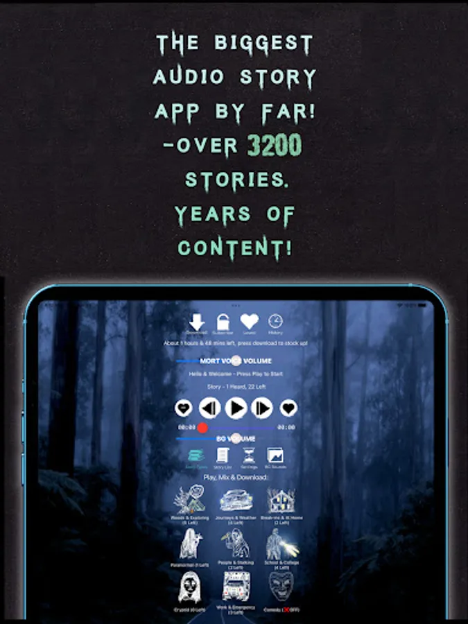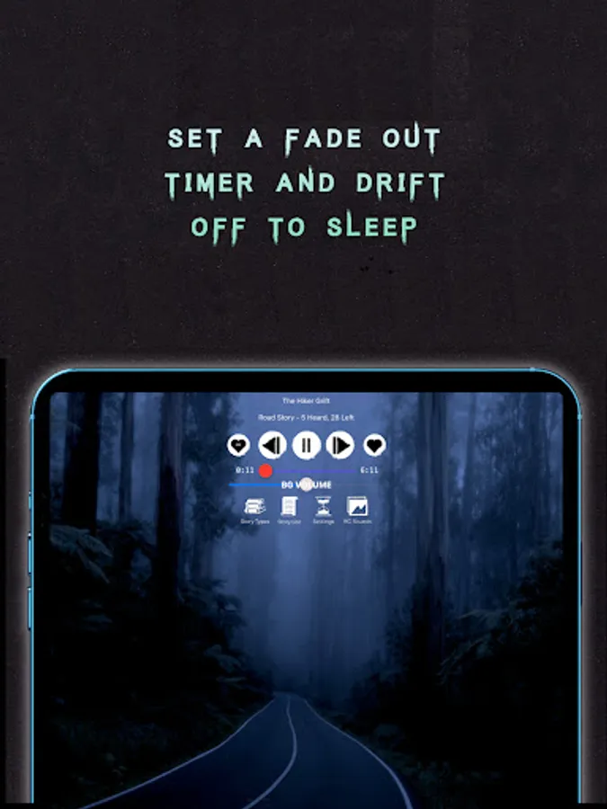 App is fully customizable, choose the type of stories you want to hear, access Mortis Media's incredible archive of audio stories, select background ambient sounds and music, fade out timer, perhaps even a hidden choose your own adventure game...