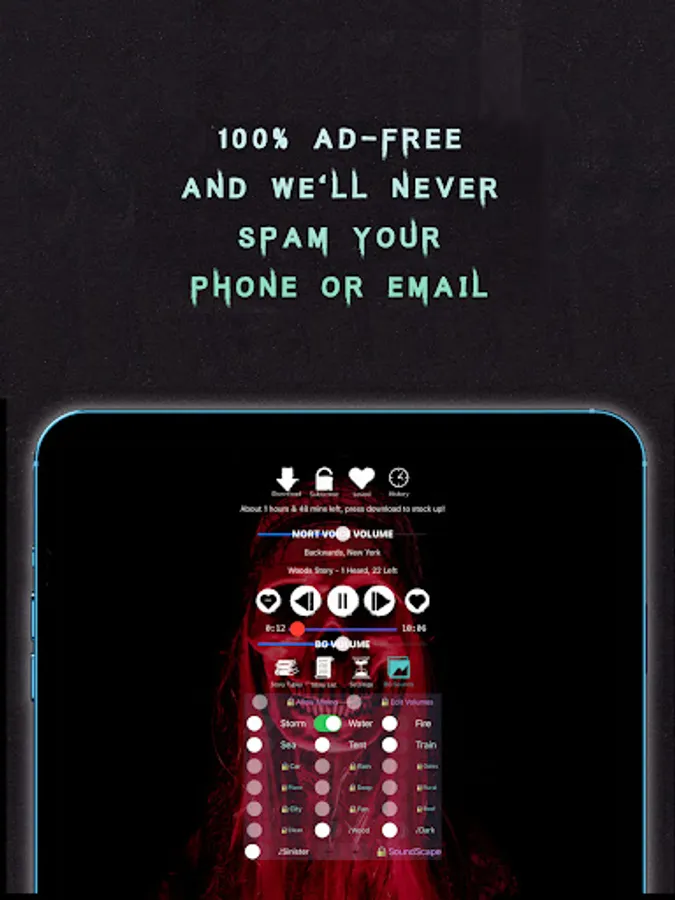 No ads, no spam, works offline, loads of background ASMR sounds, comes with over 4 hours of audio built in plus over 3000 stories ready to download.