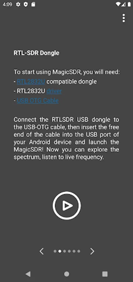 To start playing with MagicSDR, you need to set up a server on a host computer to which SDR peripherals (rtl-sdr dongle, Airspy) will be connected or connect SDR peripherals directly to a smartphone via a USB OTG cable. To try application without SDR peripherals, MagicSDR can emulate a virtual radio device.